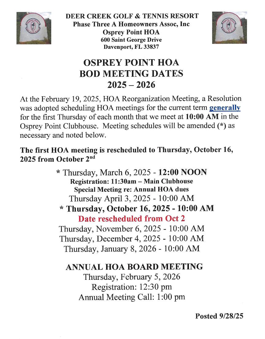 HOA BOARD MEETING DATES 2025 - 2026